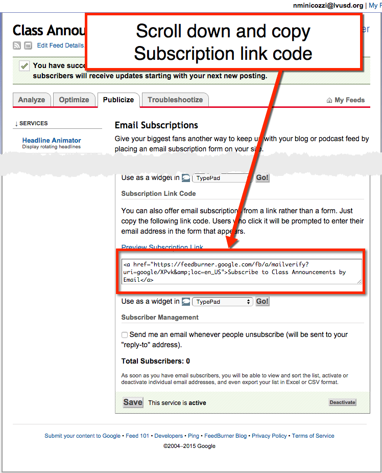 The problem, though, is that the default “Subscribe to posts” button that appears on the page doesn’t work for all browsers and can’t be removed. The good news is that there is another Google tool, Feedburner, that gives people a way to subscribe to your updates. There are several steps, but it’s actually very easy to do.